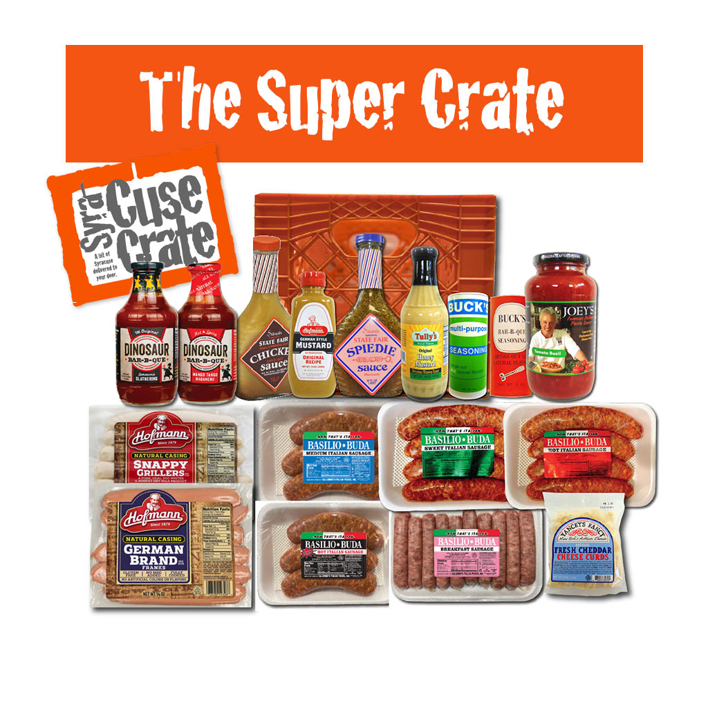 Here is the mother of all Crates!  You spoke – We listened.  Now customize however you’d like.  Choose any 6 amazing meats from Hofmann, Gianelli & Buda Basilio or Cheese curds from Yancey’s Fancy.  Then choose from a select group of 5 sauces or sides from brands like Dinosaur BBQ, Tully’s, Joey’s Restaurant, State Fair Spiedie Sauce or Buck’s!!!  You cannot go wrong with this package!  Perfect for any tailgate, cookout or special event!